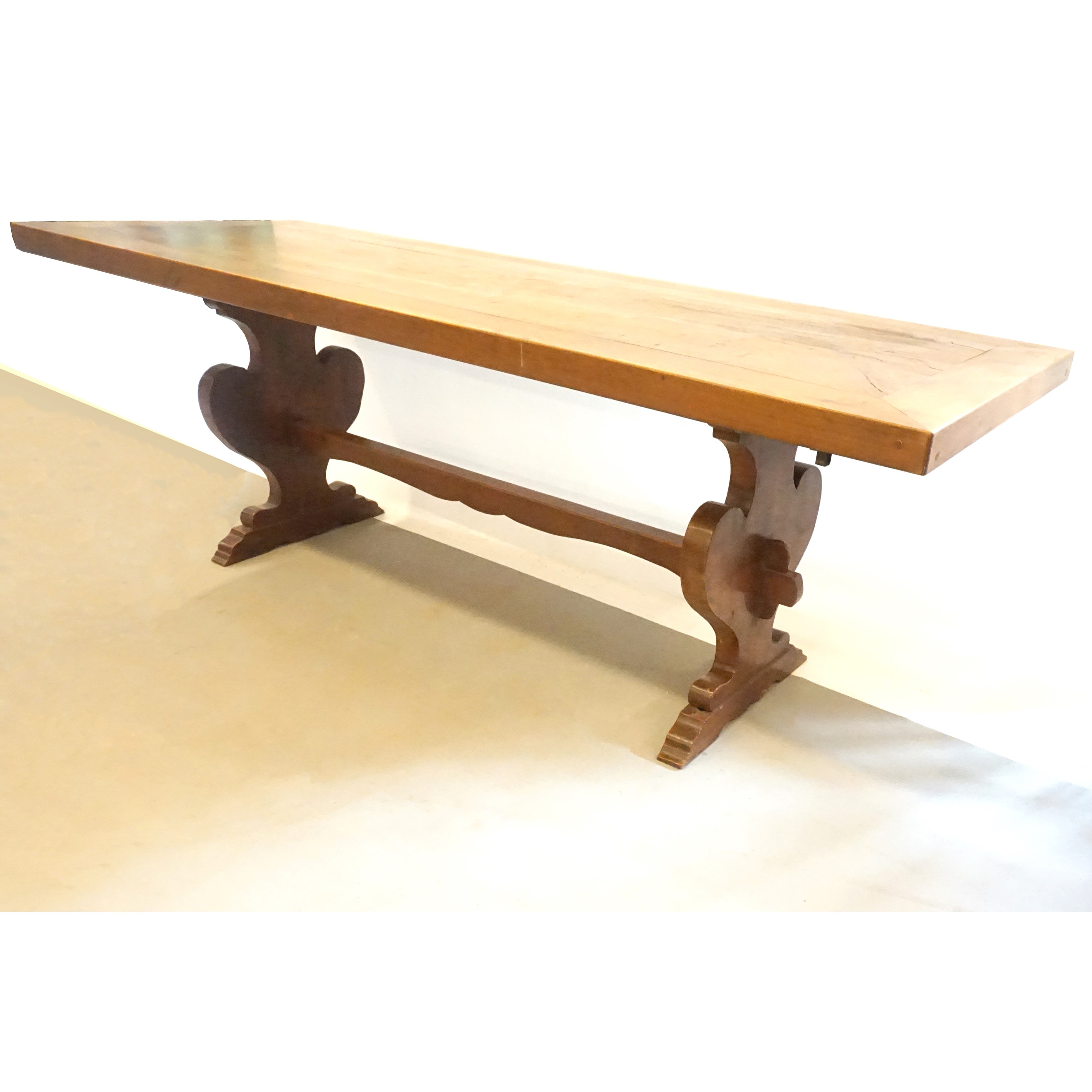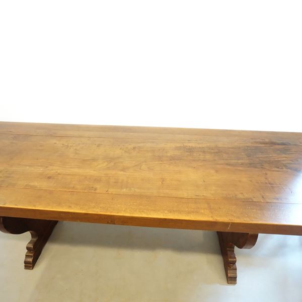 in vari legni, piano rettangolare, gambe a vaso, unite da traversa, cm 227x82x78