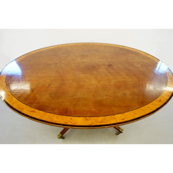 piano ovale, gamba centrale su quattro piedi scanalati su rotelle, cm 160x120x70