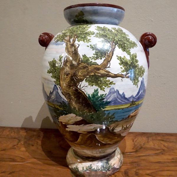 in terracotta smaltata raffigurante paesaggio con battaglia, alt. cm 39