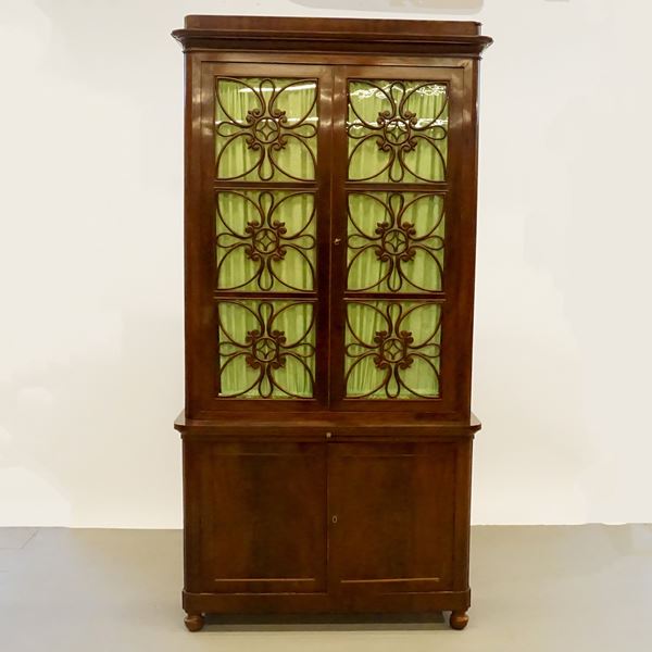 in mogano, quattro sportelli, due dei quali in vetro, piano scorrevole, cm 115x37x245
