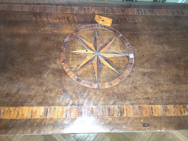 in radica intarsiata, fronte a tre cassetti decorato da figura femminile in vesti classiche, cm 118x54x86