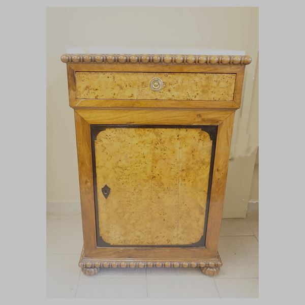 in radica di tuya e noce, uno sportello, un cassetto, piano marmo, cm 96x63x50