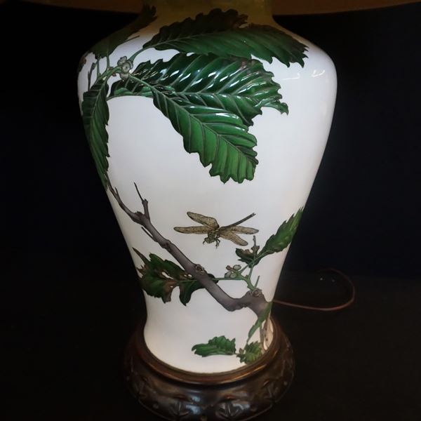 in porcellana decorata a bassorilievo e dipinta in policromia con foglie, rami ed insetti, alt. cm 82