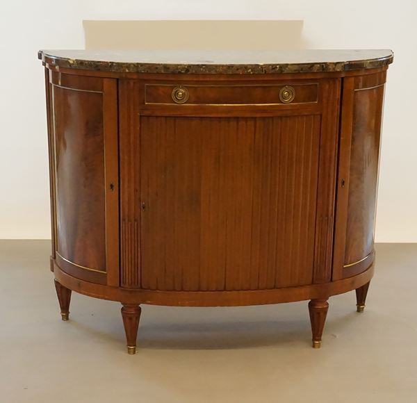 in noce a demi-lune, piano in marmo, fronte a tre sportelli ed un cassetto, cm 129x46x103