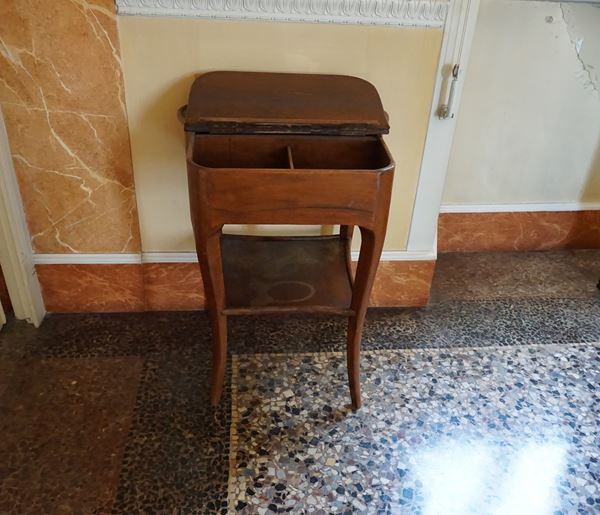 piano sagomato diviso in due parti di cui una incernierata e l'altra con due contenitori cilindrici estraibili in metallo, gambe mosse riunite da ripiano sagomato, cm 53x48x69