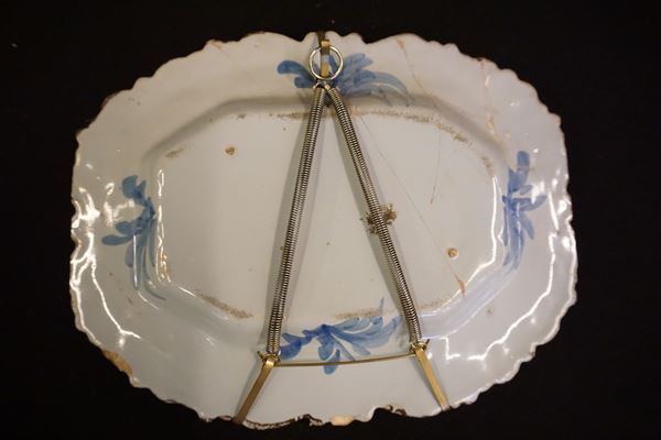 in maiolica, di forma ottagonale, con decorazione a paesaggio, cm 18x23, piaccoli danni