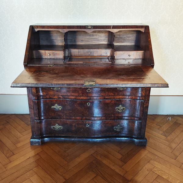 in noce, fronte mosso a tre cassetti, sportello a ribalta, internamente cassettini e vani, cm 108x60x109
