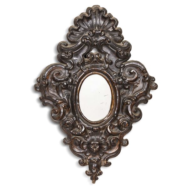 in papier maché dipinta, profilo sagomato con decori a racemi ed elementi fogliacei, a chiudere piccola luce ovale; ingombro cm 70,5x49,5. Montate a specchio