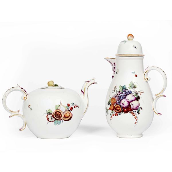 in porcellana dipinta in policromia e oro; la teiera ha corpo globulare con coperchio a sfioro, beccuccio a forma di testa di drago e ansa a doppia C con elementi in rilievo, la caffettiera ha corpo piriforme, coperchio non pertinente, beccuccio triangolare e ansa a doppia C con elementi a rilevo. Entrambe recano un decoro a policromia con assortimento di piccoli frutti e verdure, e semis sparsi. Marca ruota a sei raggi in blu su fondo; caffettiera cm 19x12x9, teiera cm 9,5x18x11