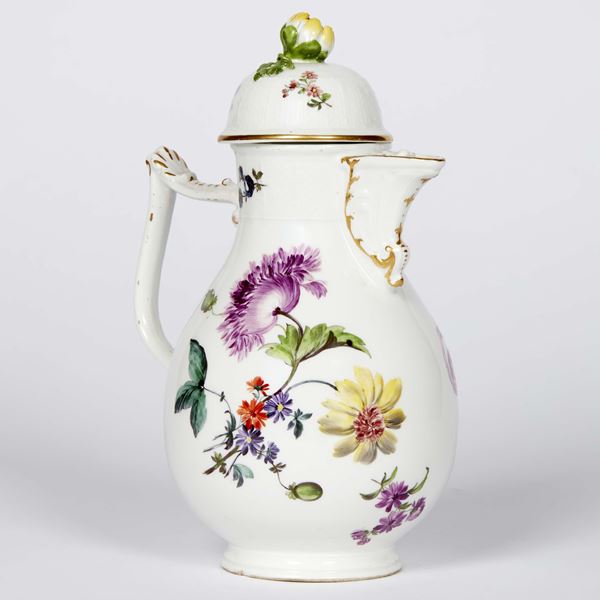 in porcellana dipinta in policromia e oro, corpo piriforme, ansa angolata e beccuccio a roccailes, coperchio a calotta lavorata a cestino con presa a forma di bocciolo; superficie decorata a fiori naturalistici con piccoli semis; cm 23x16,5x12
