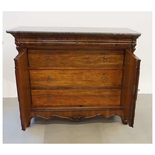in noce e radica, parti intagliate, due sportelli, un cassetto, all'interno cassetti, piani in marmo grigio, cm 130x62x103