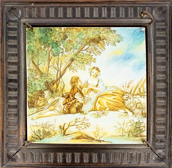 in ceramica, raffigurante scena "le delizie dell'autunno" da Francois Boucher, cm 25x25 entro cornice in legno cm 37x37,5