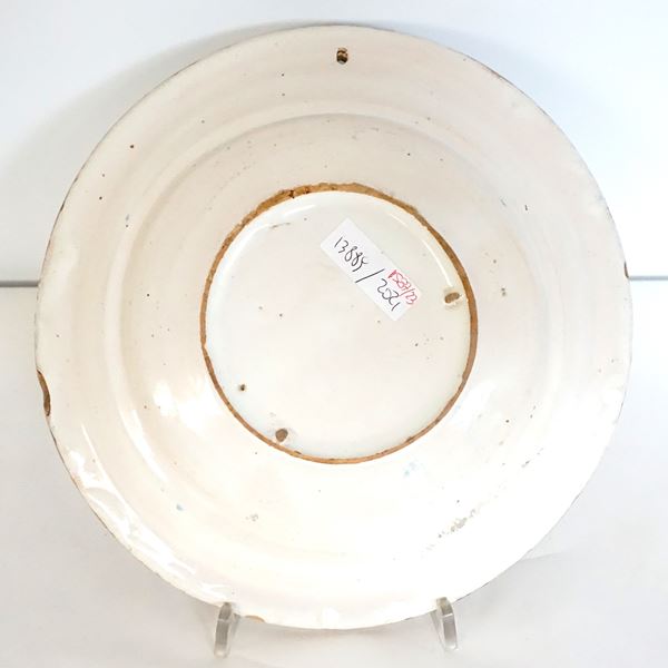 in maiolica, cavetto con figura e tesa dipinta in blu, diam. cm 22,5