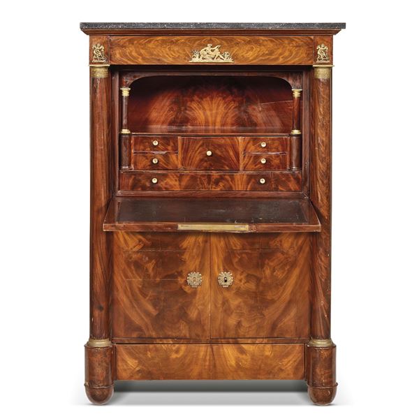 in legno di mogano, ad una anta celante un vano e sei cassetti, piano scrittoio coperto in cuoio, sottesa da coppia di ante celanti tre cassetti, riposanti a loro volta su un cassetto, entro colonne lavorate a tutto tondo, applicazioni in bronzo dorato; cm 139x93x42,5