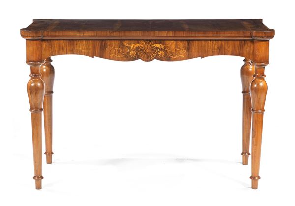 lastronati e intarsiati in varie essenze, piano di forma rettangolare ad angoli stondati, fascia sottopiano sagomata intarsiata sul fronte a ramages floreali, gambe tornite, cm 86x133x61