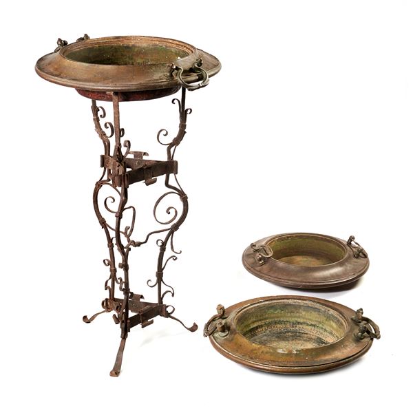 in ottone, di cui uno con base in ferro battuto, diam. cm 43, cm 47 e cm 39, alt. base cm 76