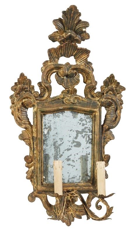 in legno intagliato e dorato, profilo modanato, due braccetti ricurvi, cimasa a giorno a due volute affrontate dalle quali si dipartono pampini di uva che scendono sui lati, cm 34x37