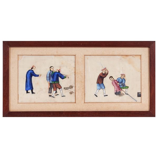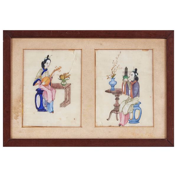 sei disegni su carta di riso, cm 16x24; cm 19x14 e cm 16x18, in tre cornici