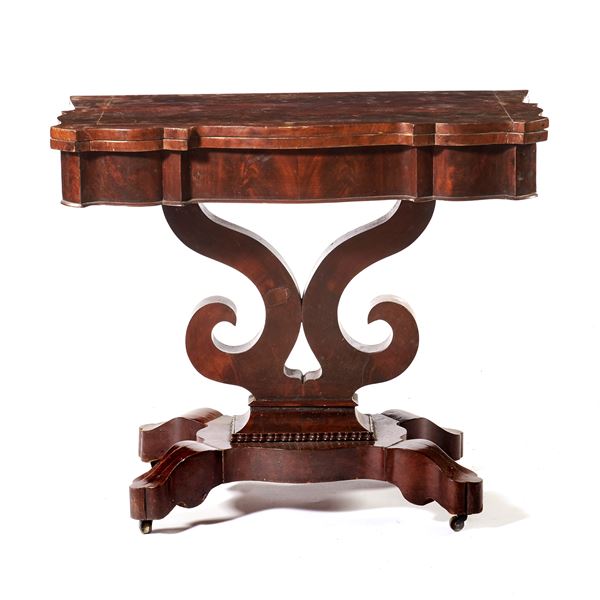 in mogano, piano sagomato a ribalta, gamba centrale a lira