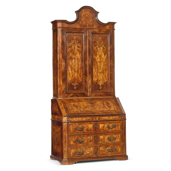 in noce e radica, corpo superiore a doppio sportello interessato da bella lastronatura, con vari ripiani e vani a giorno al suo interno, sormontato da cimasa di linea sagomata, ribalta sottostante apribile a celare sei cassetti di linea mossa, angoli scantonati e tre ulteriori cassetti sottostanti; anche i fianchi presentano riserve lastronate; su piedi a mensola, cm 276x126x67, difetti