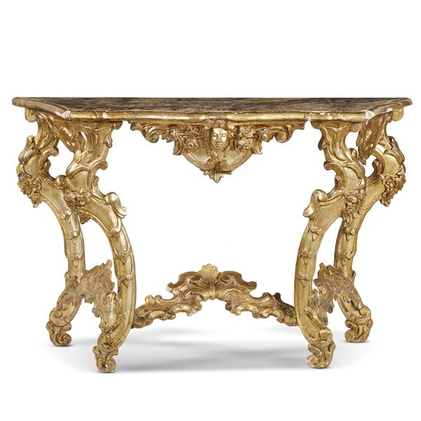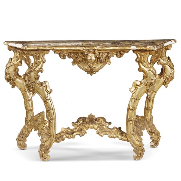 in legno laccato e dorato, piano di linea sagomata dipinto a finto marmo sotteso da fascia centrata da volto femminile tra fiori e volute che si portano sui lati, mentre conchiglie tra volute decorano i fianchi, gambe mosse ornate al centro da fiori terminanti a ricciolo e riunite da traverse sagomate a volute a centrare foglie, cm 89x142x54