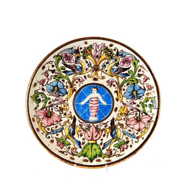 in maiolica, ampia tesa a girali, al centro putto in fasce, diam. cm 37, difetti