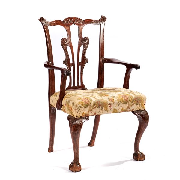 in mogano intagliato, braccioli e gambe sagomate, alt. cm 99, difetti