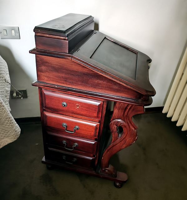 in mogano, otto cassettini laterali, piano a ribalta, internamente otto cassettini