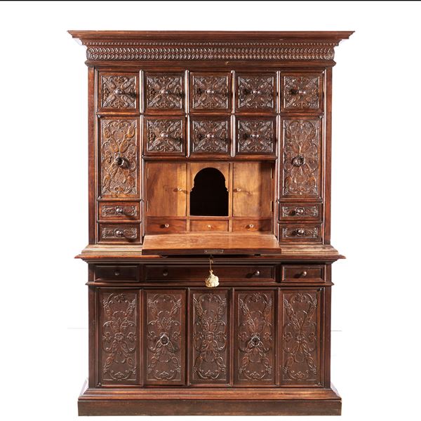 in noce intagliato, fronte a quattordici cassetti, sei sportelli, uno dei quali a ribalta con all'interno due sportellini, tre cassetti e vano a giorno, cm L136xP44xH185, difetti