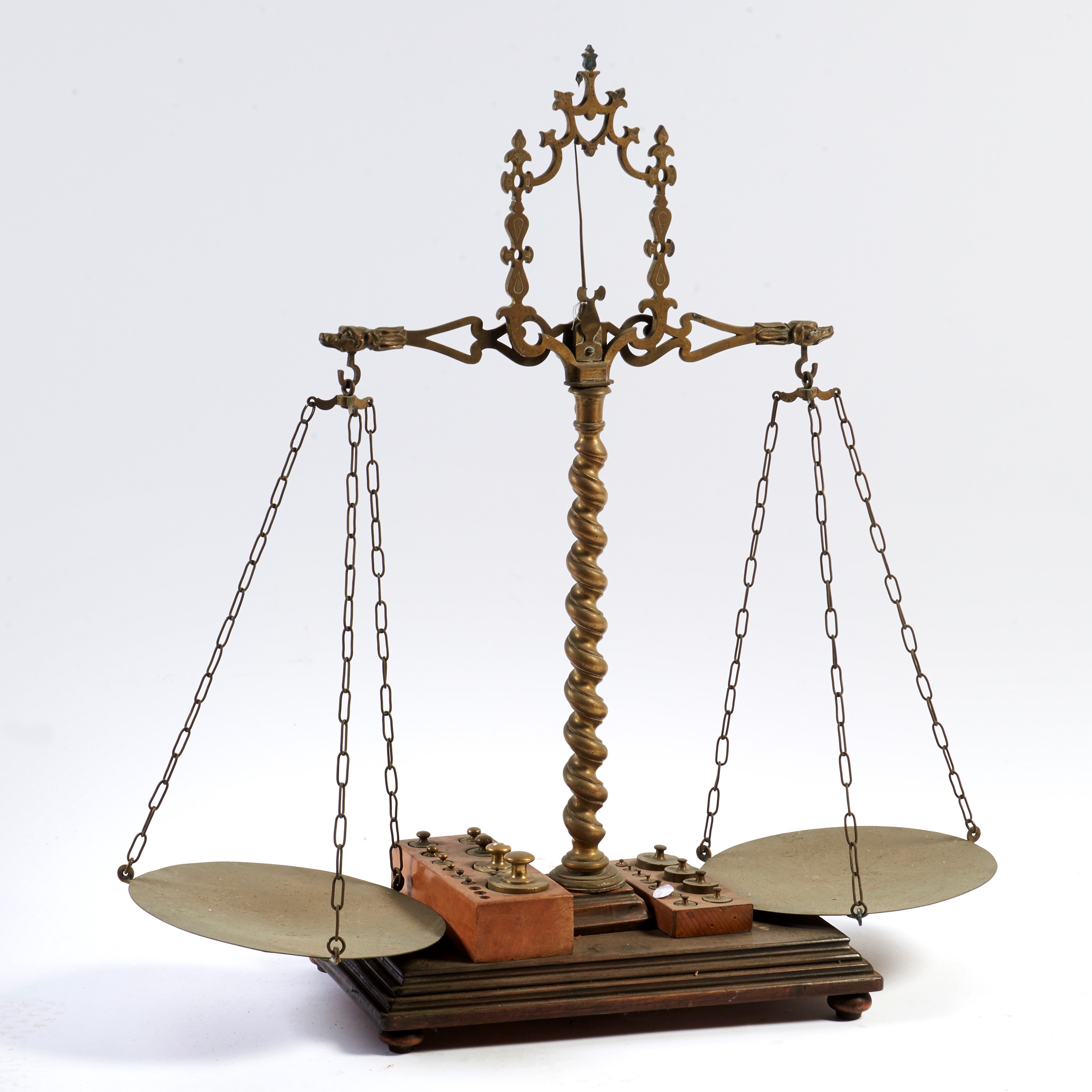 da tavola, in metallo dorato, base in legno; completa di pesi, cm L80xP27xH84