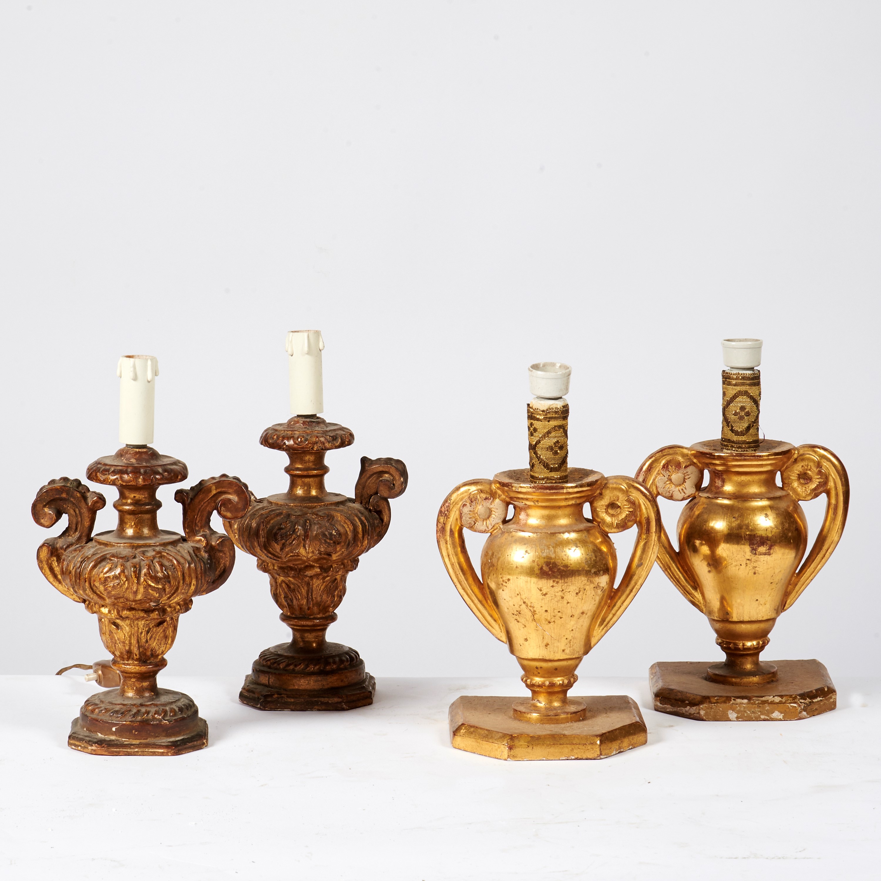 in legno dorato e intagliato, alt. cm 22 e alt. cm 20