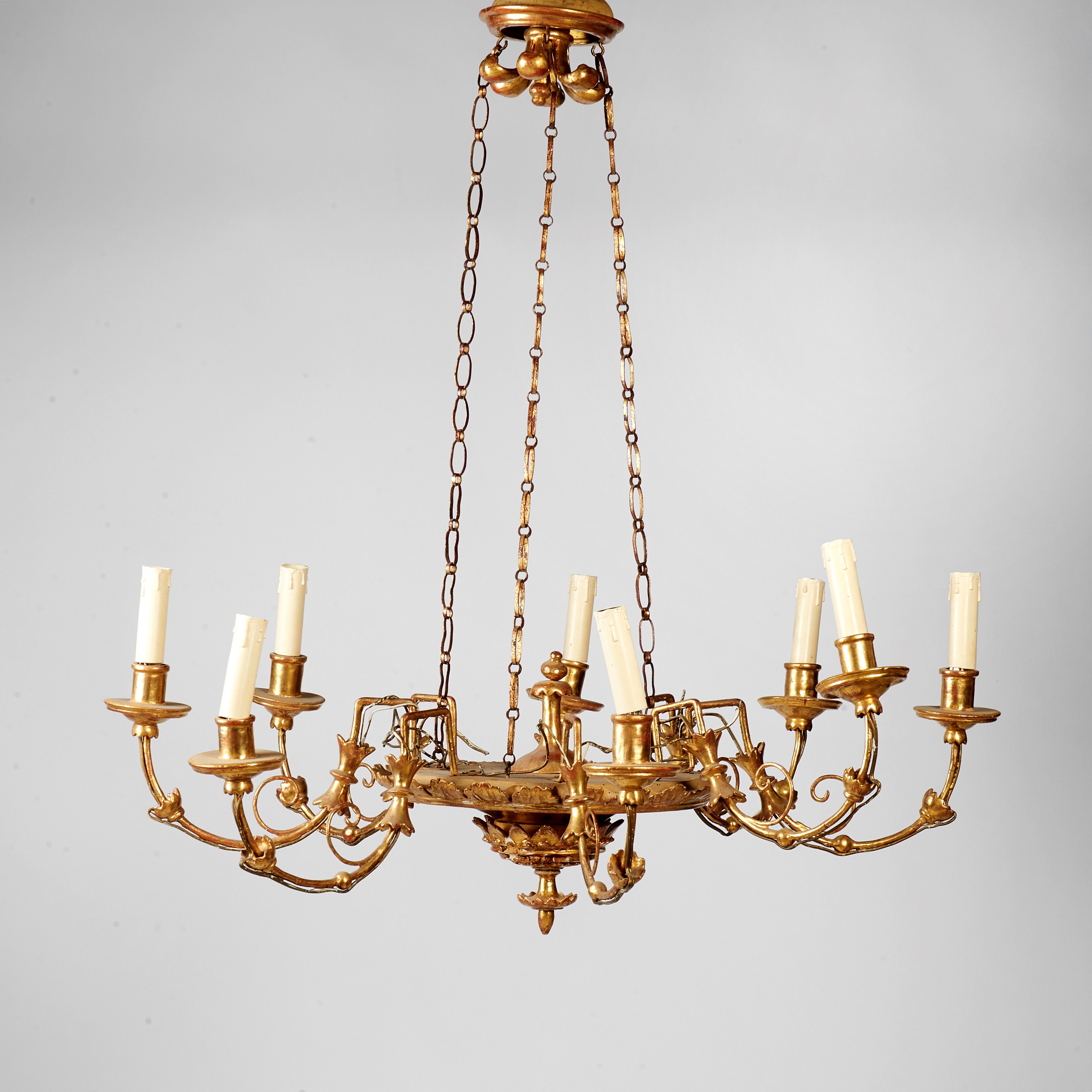 in legno intagliato e dorato, a otto luci, diam. cm 84 alt. cm 85