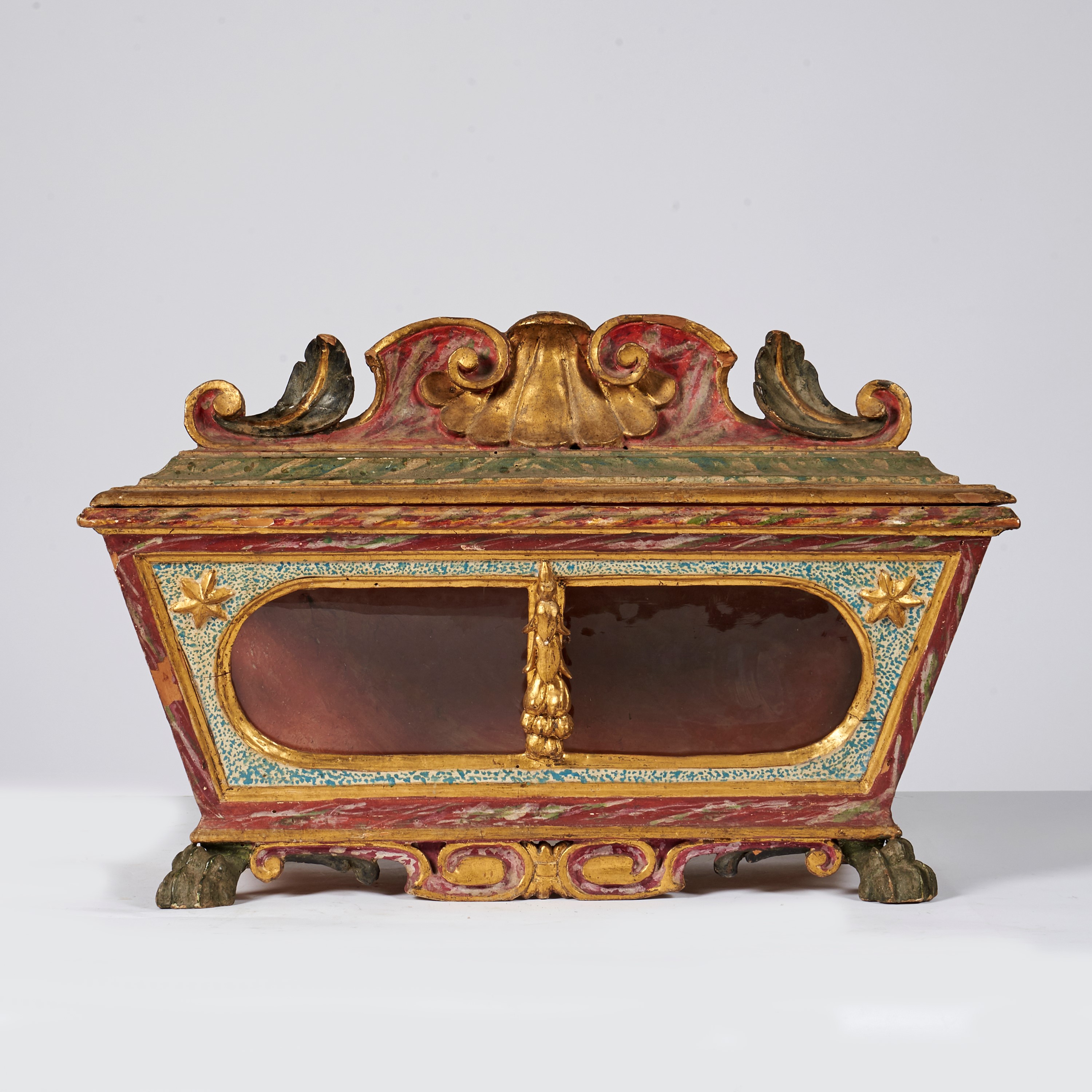 in legno laccato a finto marmo e dorato, piano ad alzarsi, fronte a laterali con vetro, cm L60xP29xH39