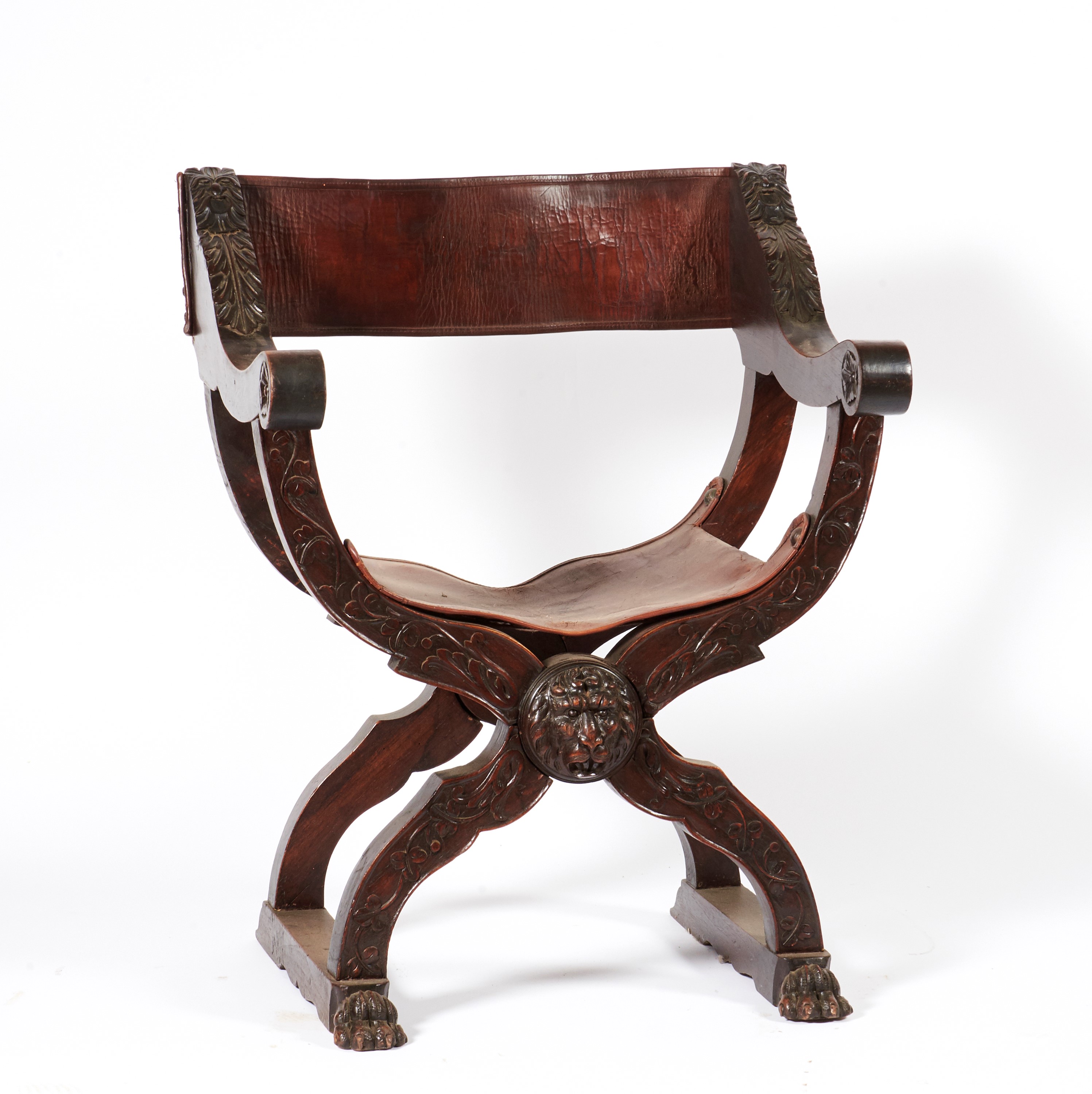 in noce intagliato, con seduta e schienale in cuoio, cm L76xP58xH100