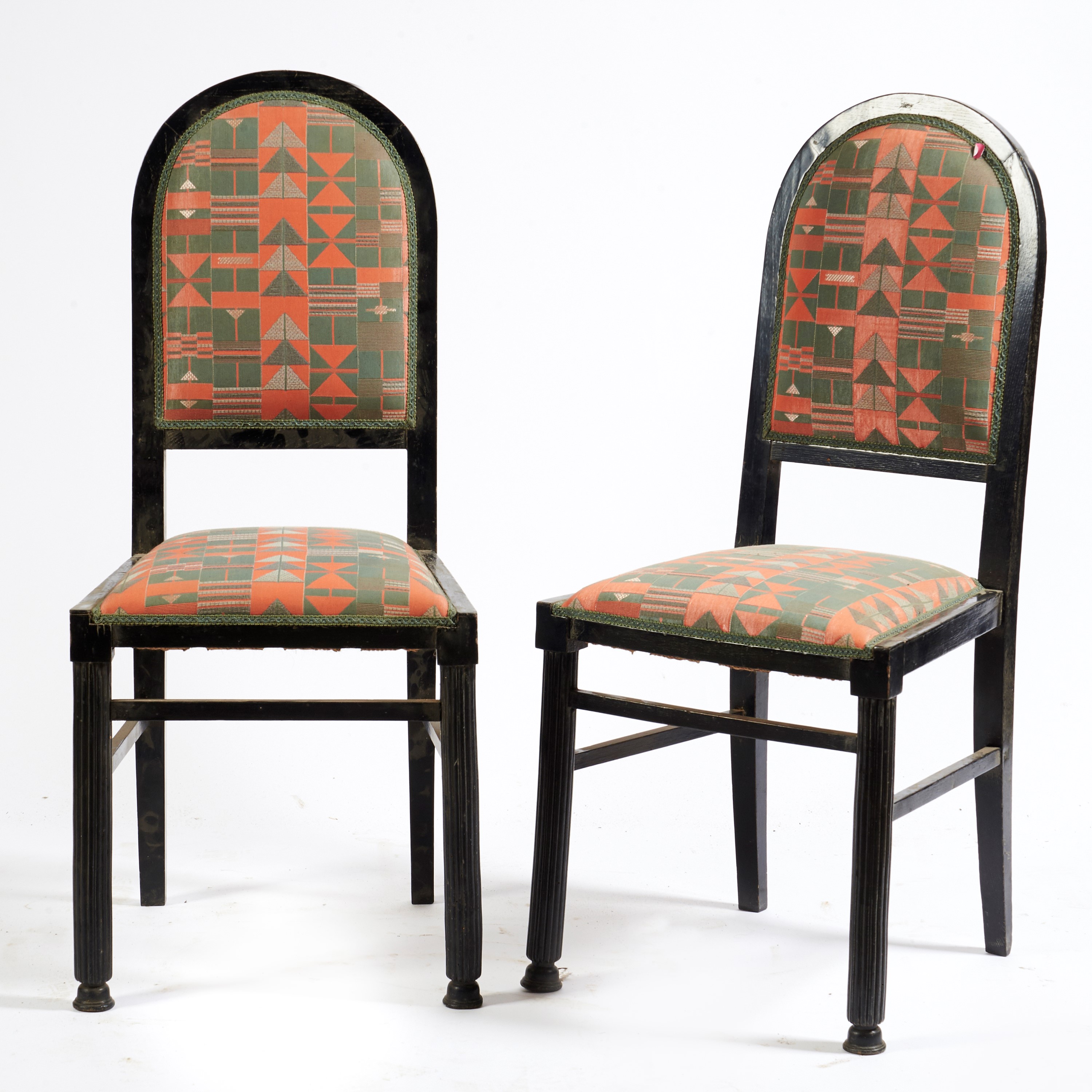 struttura in legno laccato nero, imbottite e rivestite in stoffa a motivo geometrico nei toni del rosa e del turchese, alt. cm 103