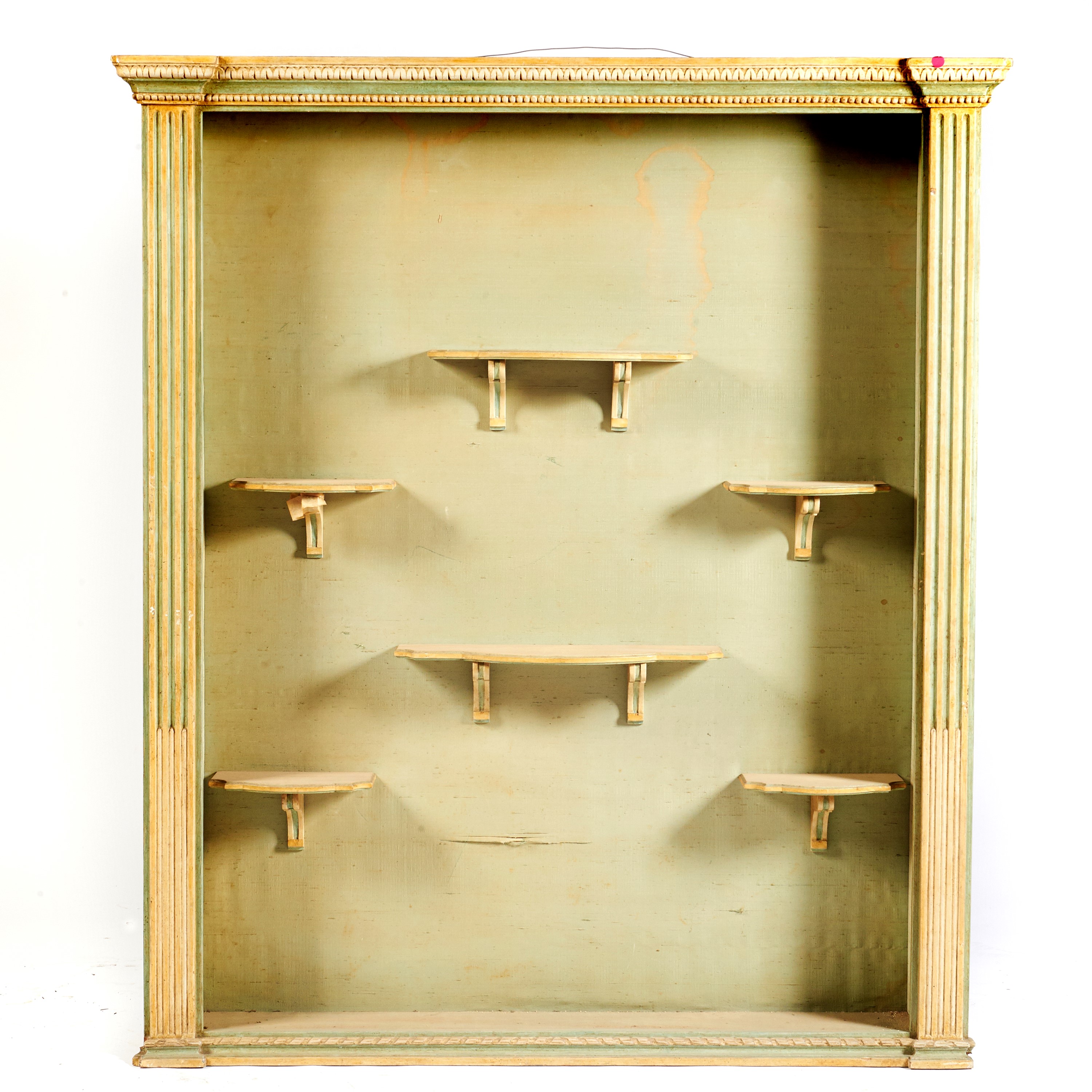 in legno laccato e dipinto nei toni del verde e dell'oro, con cinque ripiani, fondo rivestito in stoffa, laterali scanalati, cm 132x20x151