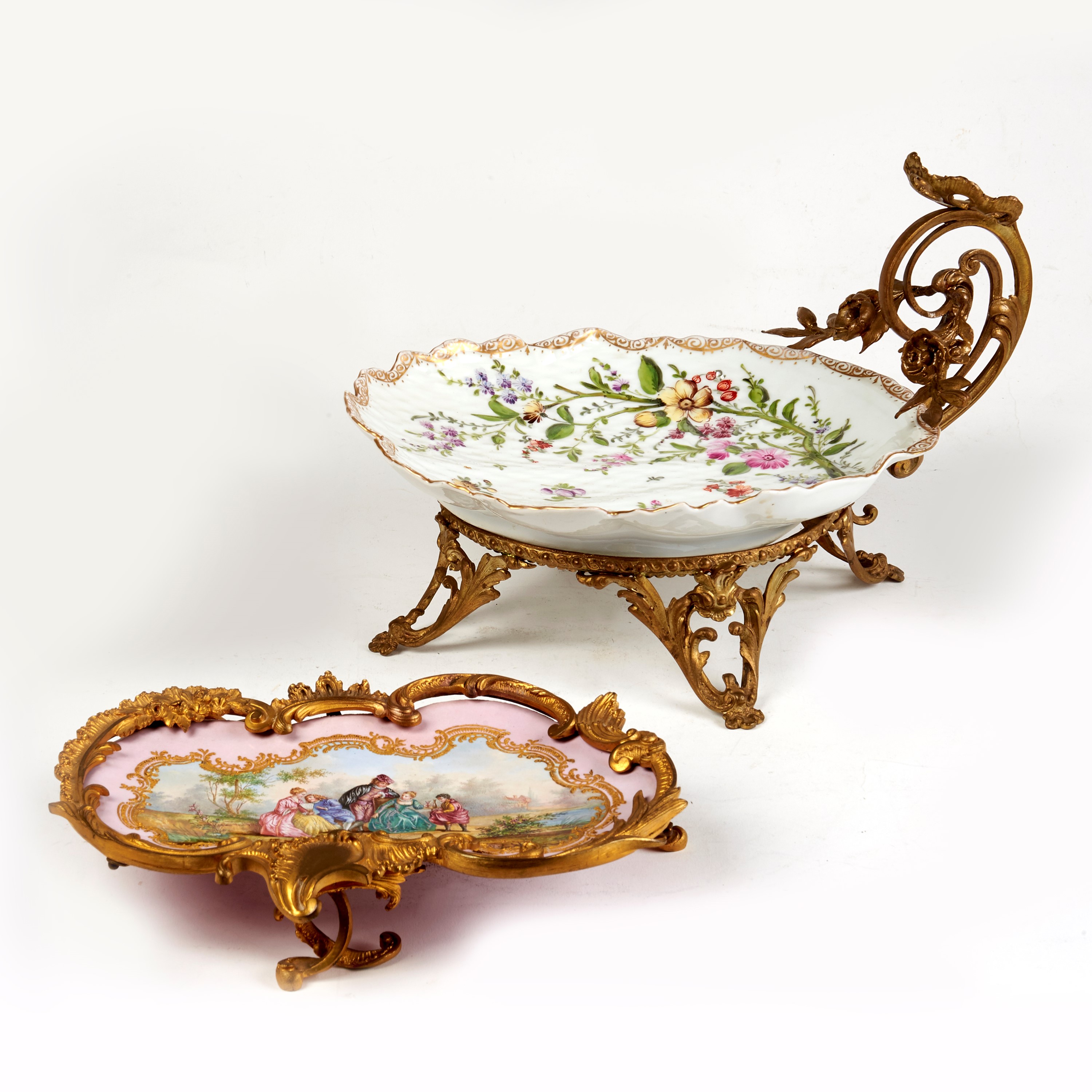 in porcellana dipinta in policromia, con montatura in bronzo, cm 33x21,5