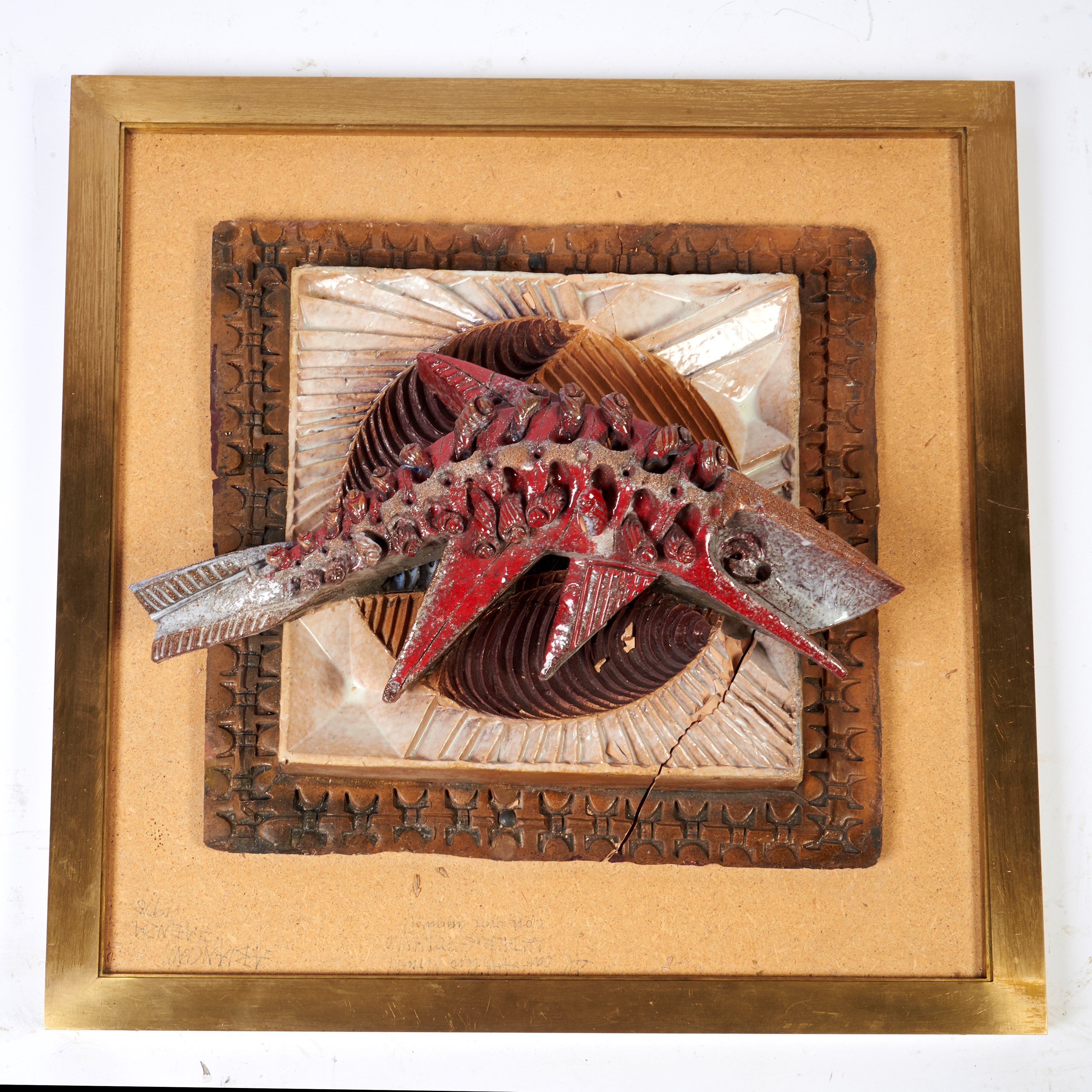 rilievo in terracotta invetriata, cm 50x50, applicato su pannello, rotture