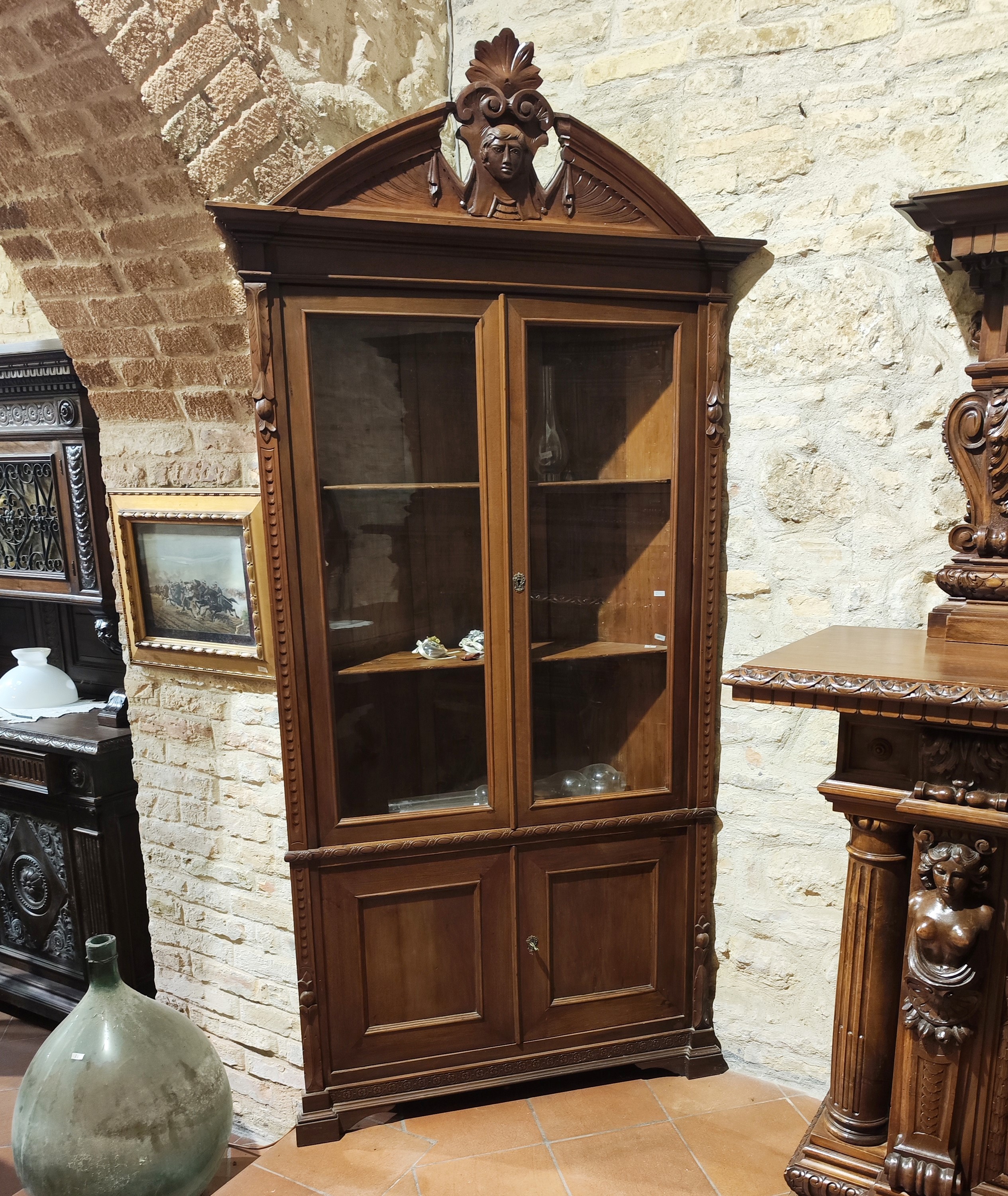 in noce, quattro sportelli due dei quali in vetro, cm L112xP45xH230