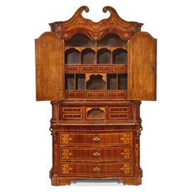 in legno lastronato e filettato con inserti in acero a ramages ad impreziosire fronte e fianchi; alzata a doppio sportello centinato, che all'interno nasconde diversi vani sagomati con cassettini sottostanti, sormontato da cimasa a doppia voluta; parte inferiore apribile a ribalta celante scarabattolo, con vano sagomato centrale affiancato da due cassetti per lato e piccolo piano a scorrimento, sottesa da tre cassetti; fianchi di linea leggermente mossa su piedi a mensola, cm 260x144x67