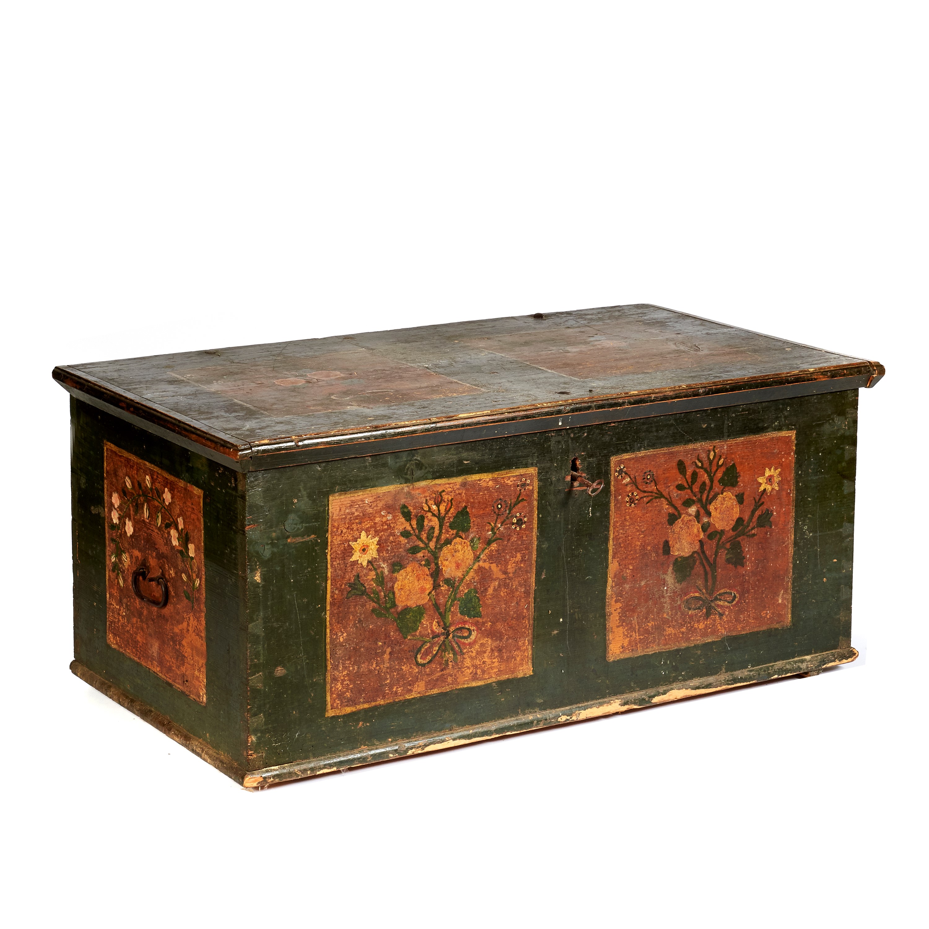 in abete laccato e dipinto a fiori, due maniglie sui fianchi, cm L120xP67xH55, difetti