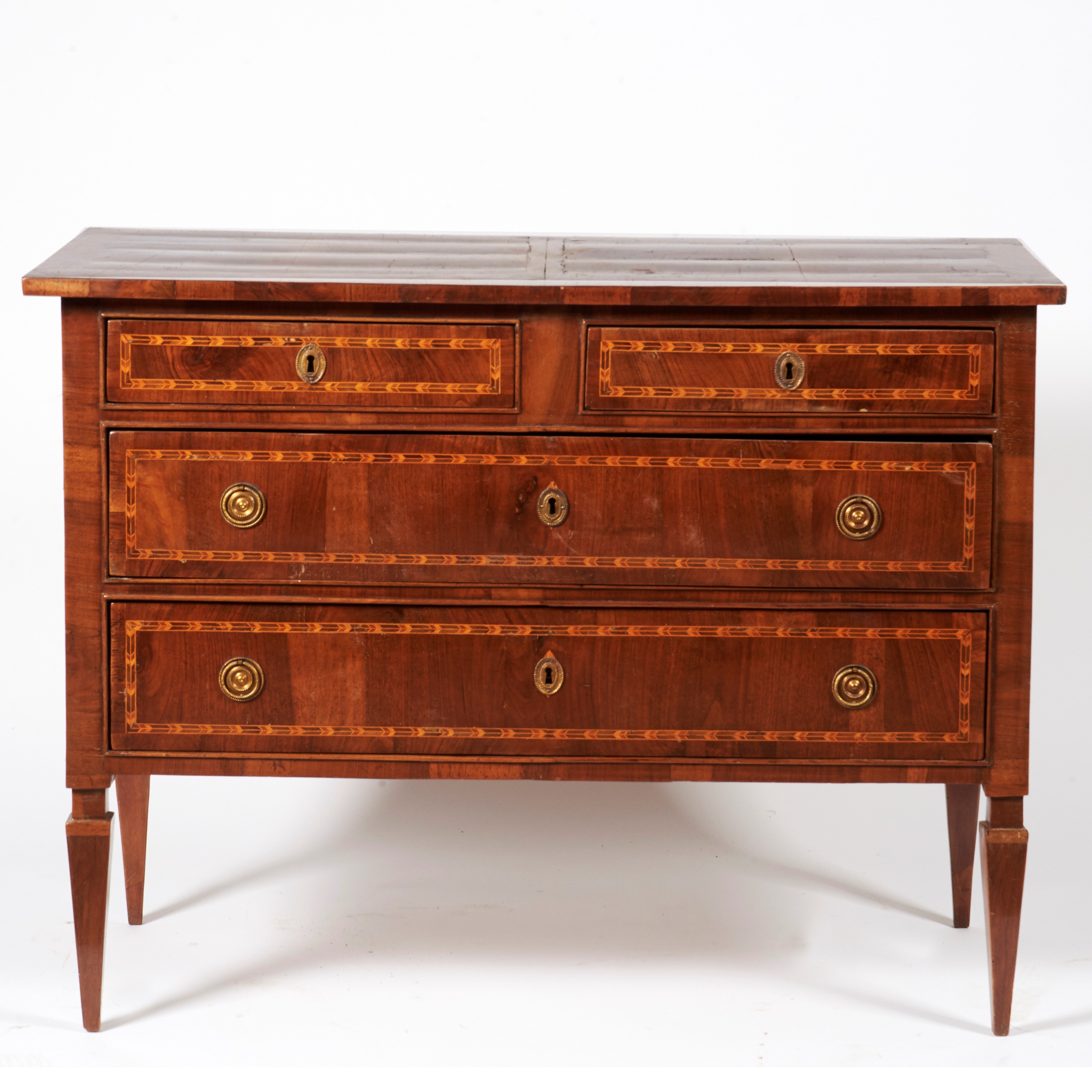 in noce intarsiato, quattro cassetti, gambe a spillo, cm 117x59x88, difetti