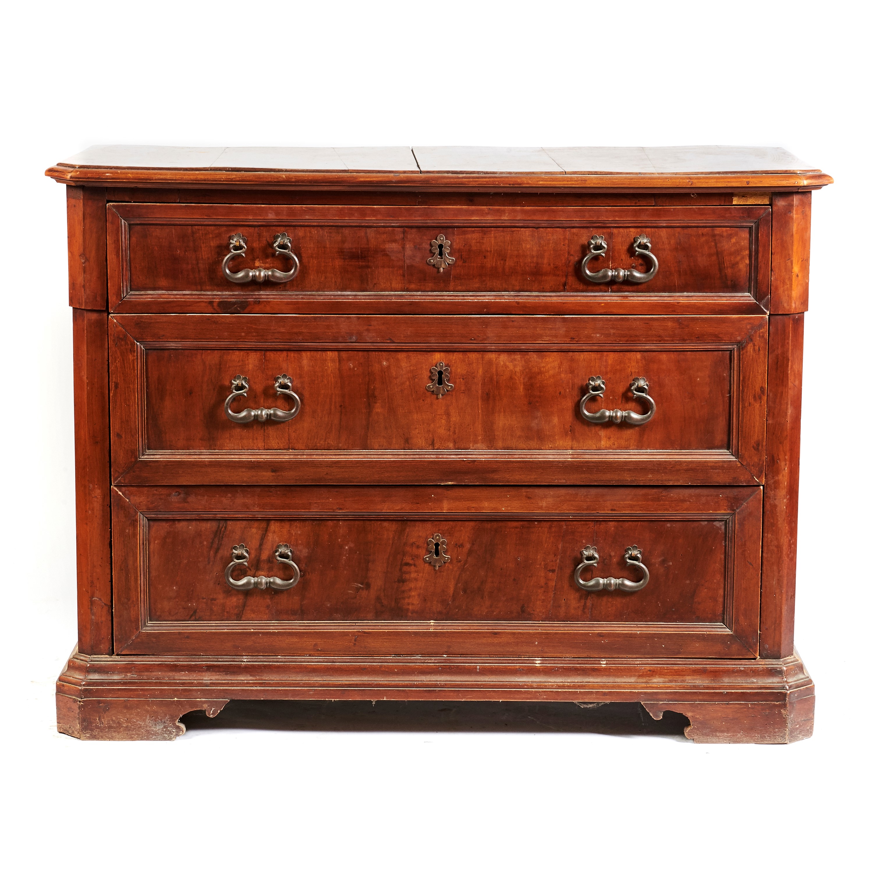 in noce, fronte a tre cassetti, piedi a mensola, cm L127xP45,5xH95, difetti