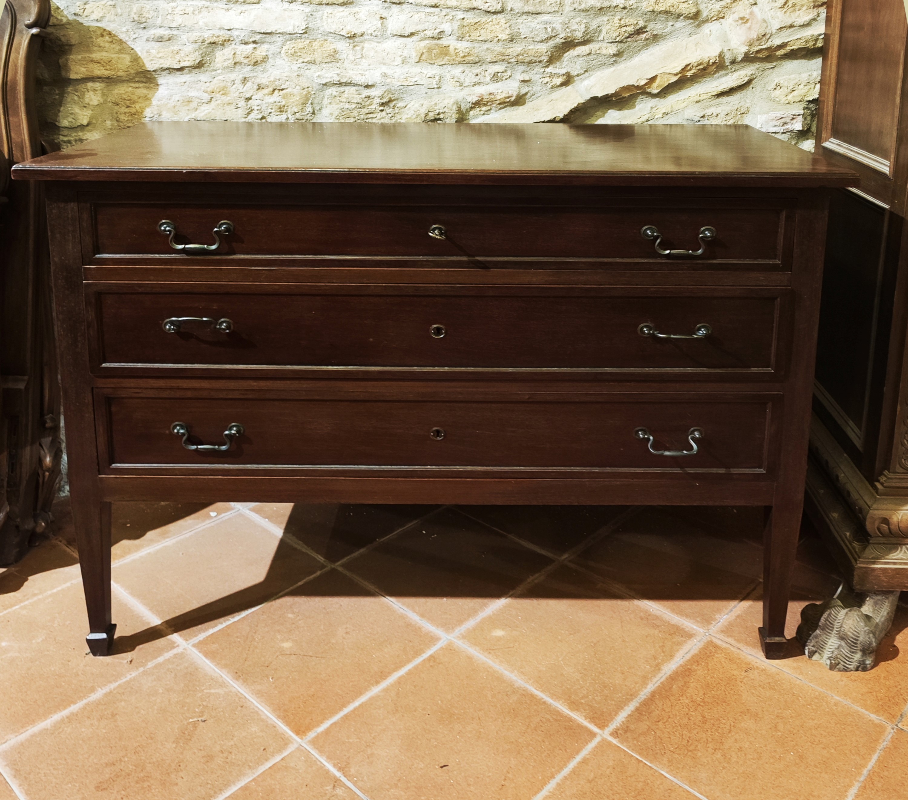 in mogano, tre cassetti, piedi a spillo, cm L118xP56xH96