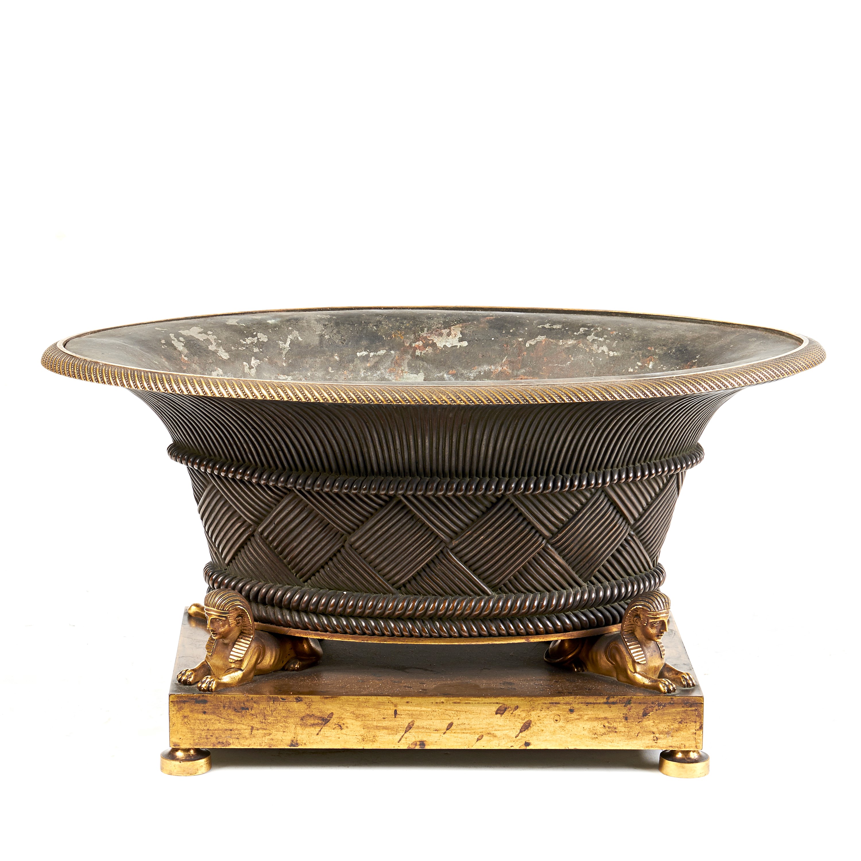 in bronzo di forma ovale con sostegni a sfingi e base rettangolare, cm 37x25x20