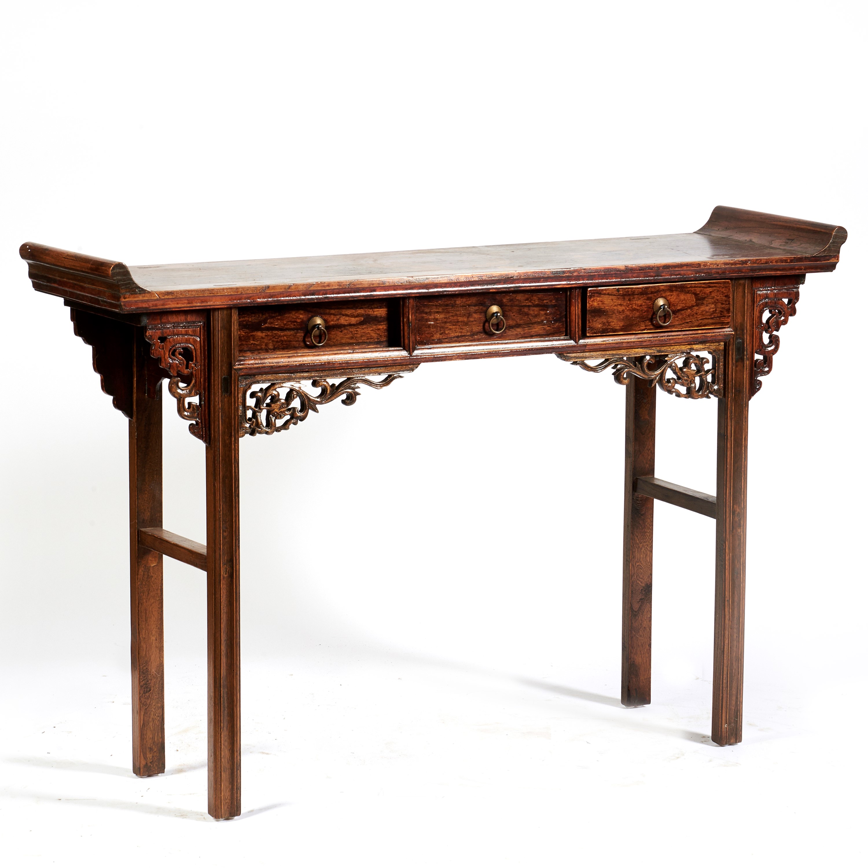 in legno intagliato, fronte a tre cassetti, cm L128xP36xH85, piano da restaurare