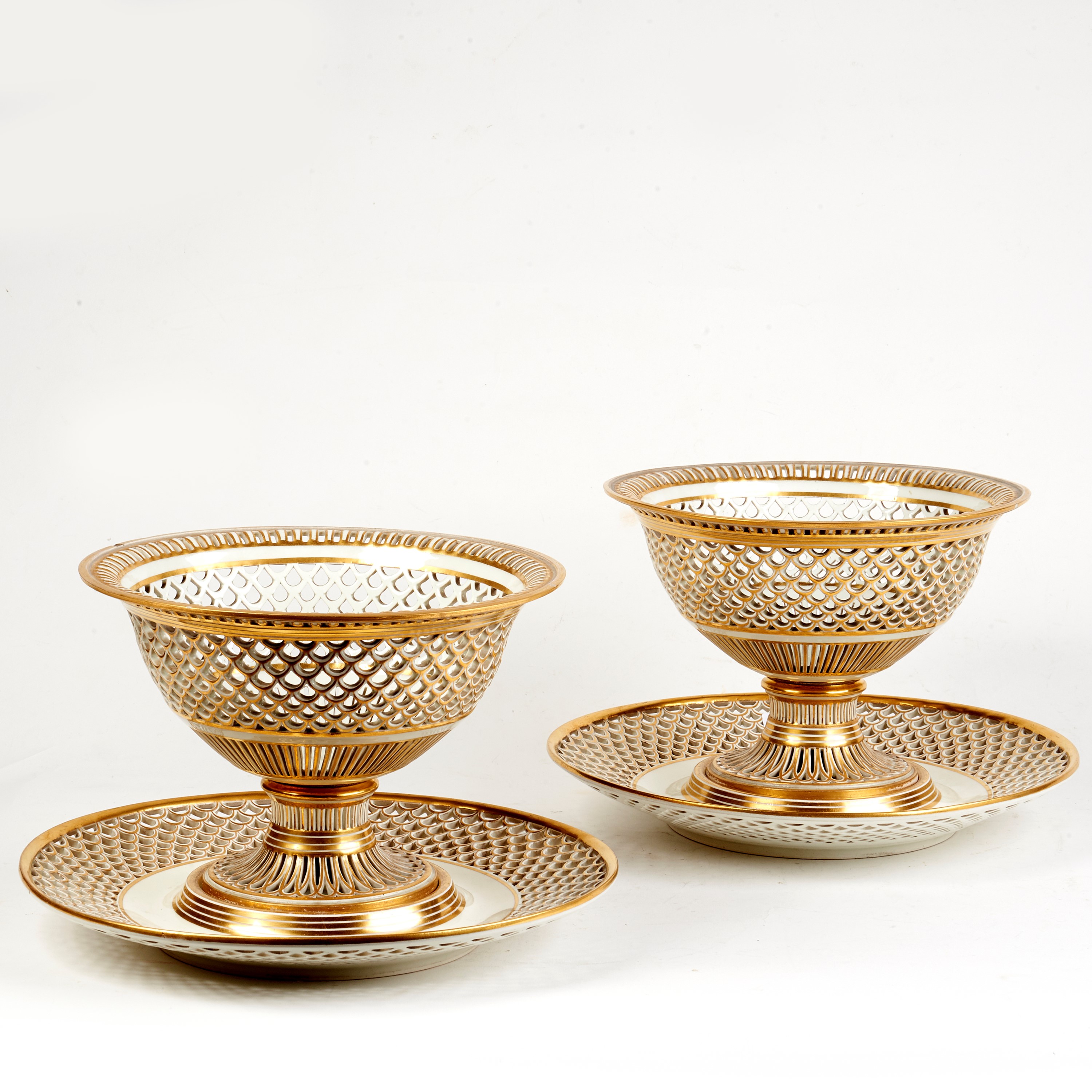 circolari in porcellana traforata bianco-oro, con presentoire, cm 30x19