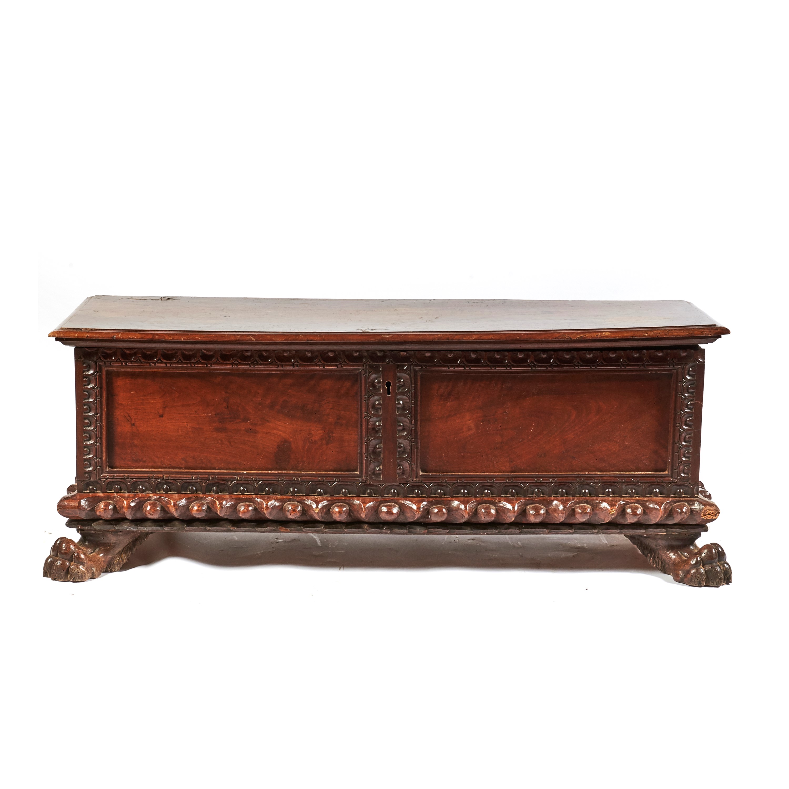 in noce intagliato, piedi anteriori a zampa ferina, cm L146,5xP51xH55,5, difetti