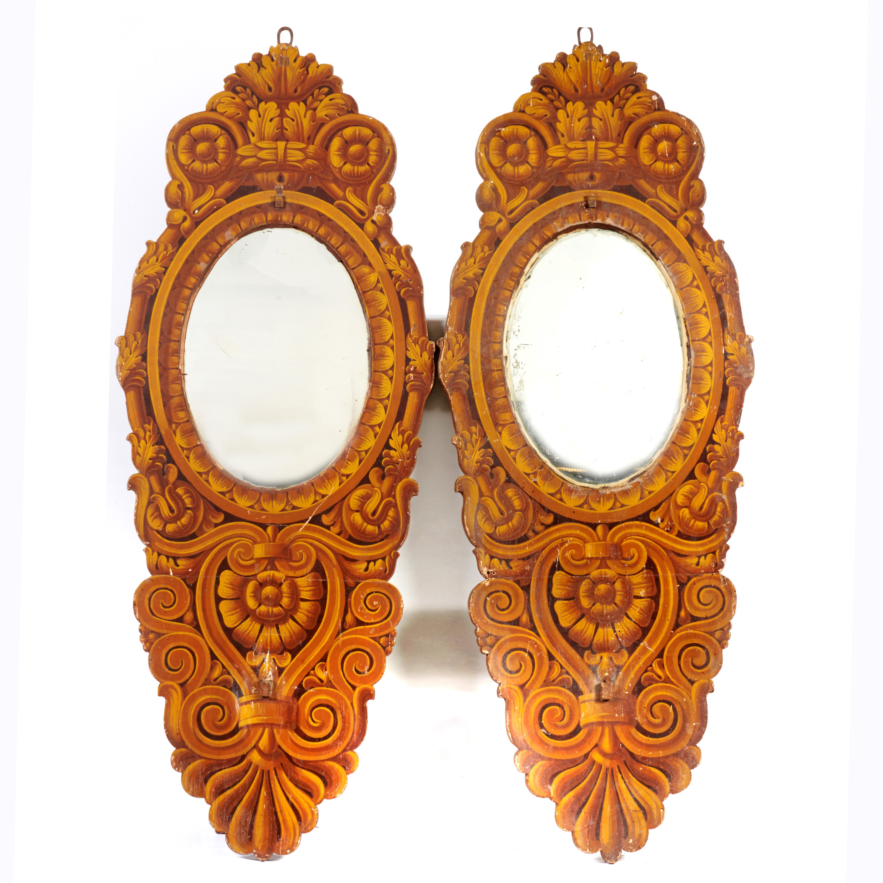 in legno intagliato e dipinto, al centro uno specchio circolare, cm 129x49, piccole cadute di colore
