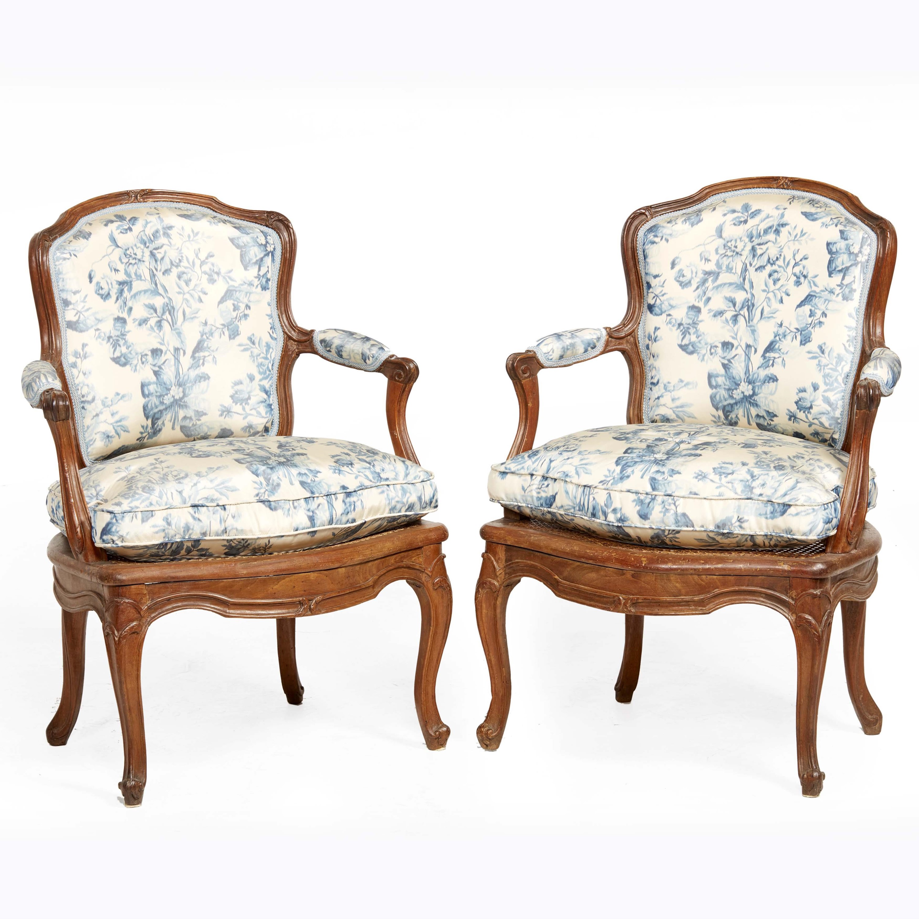 intagliata a motivi di volute vegetali, schienale di linea sagomata, sedile canné, braccioli pendaglina, schienale, braccioli e seduta sono ricoperti da raso con motivi floreali sui toni del blu, cm 80,5x60x48,5